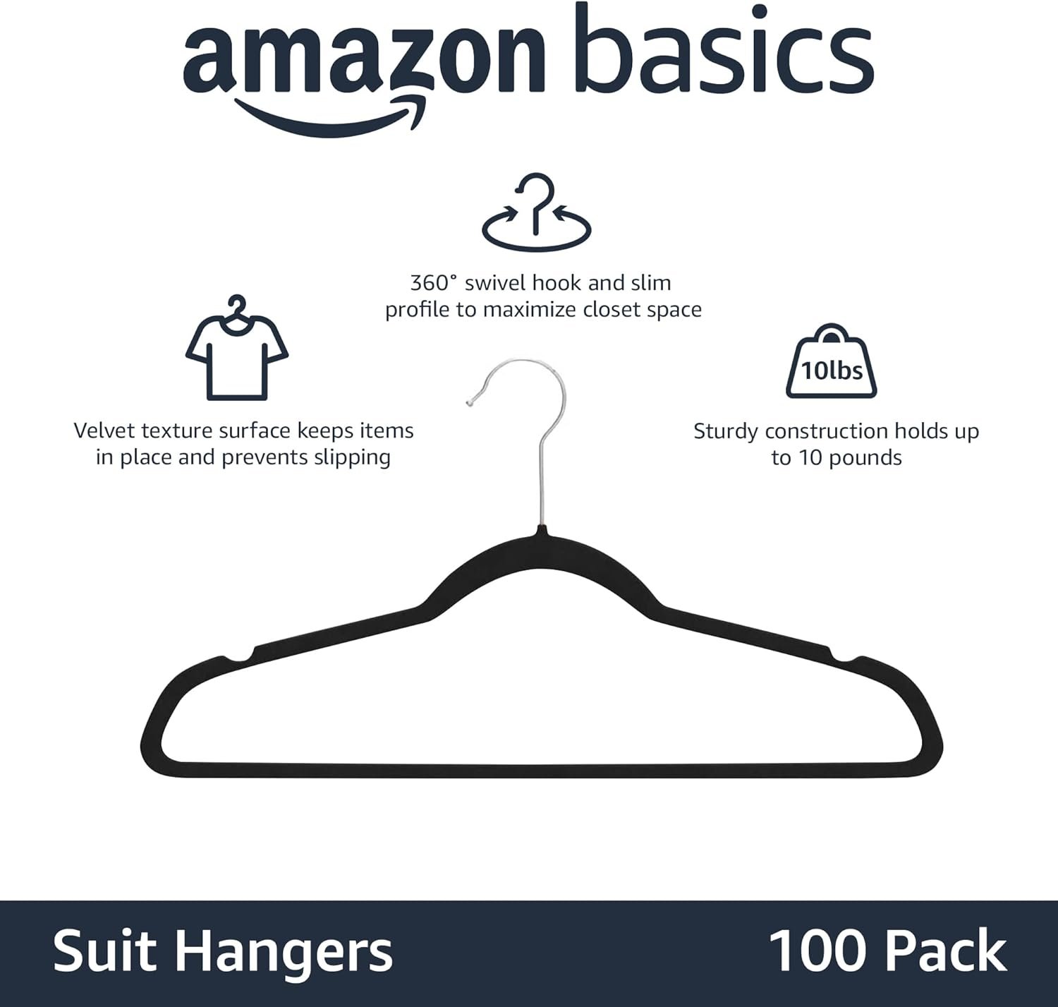 The Amazon Basics Slim Velvet Non-Slip Suit Clothes Hangers (Pack of 100) are perfect for maximizing closet space while keeping your wardrobe neat and organized. Featuring a durable metal core that holds up to 10 pounds, these hangers have a slim profile and a velvet, non-slip surface with notched shoulders to prevent clothes from slipping. Made with 84% GRS-certified recycled materials, they’re an eco-friendly and reliable choice for any closet. Upgrade your organization with these essential, space-saving hangers from Amazon Basics.